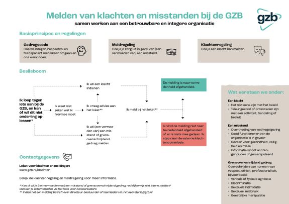 Loopt u tegen iets aan bij de GZB, en kan óf wil u dit niet onderling oplossen? Iedereen die in aanraking komt met de GZB kan een klacht, misstand of grensoverschrijdend gedrag melden. Een melding van een klacht kan via het meldloket worden gedaan. De melder ontvangt binnen twee werkdagen een bevestiging van ontvangst.