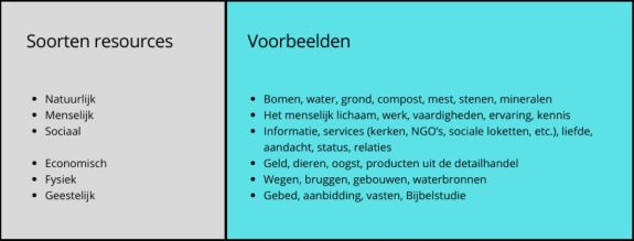 Dit klinkt misschien nog een beetje abstract. Maar laten we het eens bekijken aan de hand van het verhaal van de weduwe uit 2 Koningen 4. De weduwe had verschillende resources tot haar beschikking, meer dan alleen het kruikje olie. Ze had ook Elisa als informatiebron, ze had haar zoons die haar hielpen, de kruikjes die ze leende van de buren en haar huis.