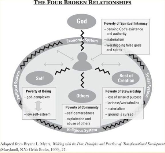 Bryant Myers, een Christelijke filosoof op gebied van ontwikkelingswerk, ontwikkelde een beeld wat ons helpt om de wortels van armoede te begrijpen1. Hij zegt het volgende: Een van Gods eigenschappen is dat Hij relationeel is. En de mens, geschapen naar het evenbeeld van God, is evengoed relationeel. Toen God de mens schiep, schiep Hij hem met vier essentiële, perfecte relaties: de relatie met God, met zichzelf, met anderen en met de rest van de schepping. De relatie met God is de eerste, fundamentele relatie. Alle andere relaties vloeien hieruit voort. De roeping van ons leven is om God te aanbidden, Hem te eren is alles wat we doen. En omdat we geschapen zijn naar Zijn beeld, heeft ieder mens waarde en waardigheid. Het erkennen van die waarde wordt gevat in de relatie met zichzelf. Dan roept de Bijbel ons op om onze naasten lief te hebben als onszelf: de relatie met anderen. En tot slot was een van de eerste opdrachten die God aan de mens gaf om te heersen over de schepping, en er zorg voor te dragen (Genesis 1:26;28). Deze vier relaties zijn de bouwstenen voor alle menselijke activiteit.