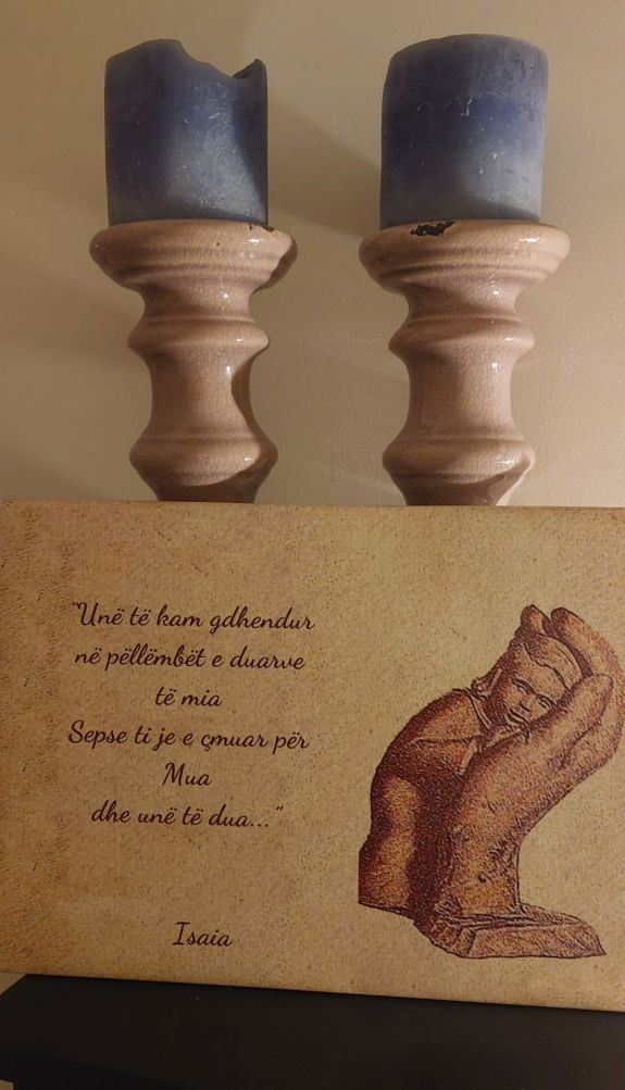 De waterfilters werden vanmorgen vervangen. De monteurs stapten binnen en één bleef staan bij het schilderij dat op mijn gangkastje staat, zie foto. Er staat: Ik heb je in Mijn handpalmen gegraveerd, omdat jij kostbaar voor Mij bent en Ik van je houd. (vrij naar Jesaja 49).