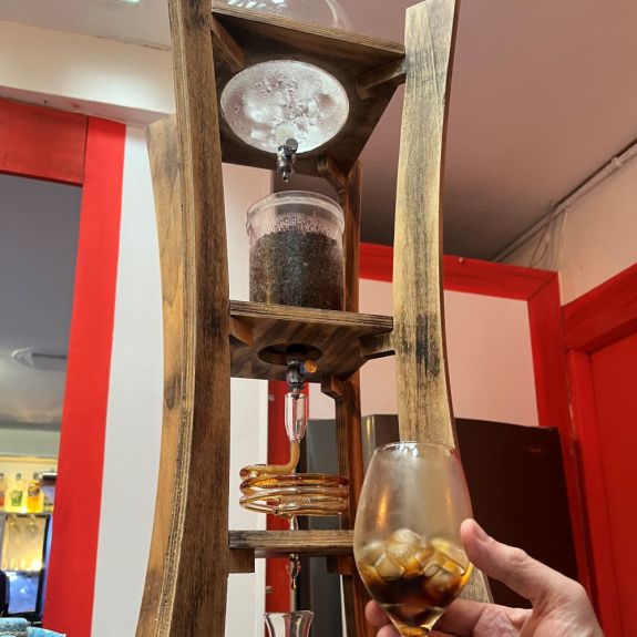 Op de bovenste richel van een houten rek, zo’n halve meter hoog, druppelde ijswater in een glazen pot met verse, grof gemalen koffie. Druppel na druppel. Langzaam werd de gemalen koffie doordrenkt, en de druppels vonden hun weg via een glazen spiraal naar beneden, om uiteindelijk opgevangen te worden in een glazen schenkkan. Het was een traag proces. Na acht uur druppelen had zich in de onderste kan een halve liter koude koffie verzameld. Deze koffie had een hoog cafeïnegehalte en was geserveerd met ijsblokjes van uitstekende smaak.