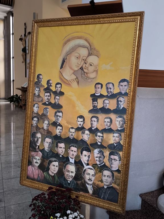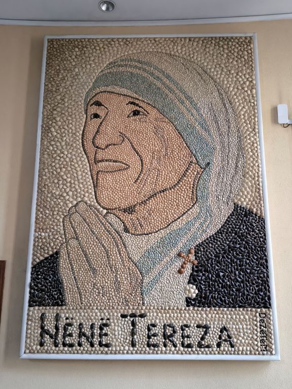 Dit keer gaan we wel het rooms-katholieke bedehuis in. In vergelijking met de barokke katholieke kerken in Nederland en Italië lijkt het maar een kale bedoening. Toegegeven, in het communistische tijdperk bleven weinig rooms-katholieke godshuizen staan. Dictator Enver Hoxha had met name een hekel aan dit geloof, dat hem herinnerde aan de Italianen die in 1939 zijn land bezetten. Na de doopkapel valt de afbeelding van moeder Theresa, gemaakt van (mossel)schelpen op. En een afbeelding van een aantal van de vele katholieke geestelijken die de smorende dictatuur niet overleefden.