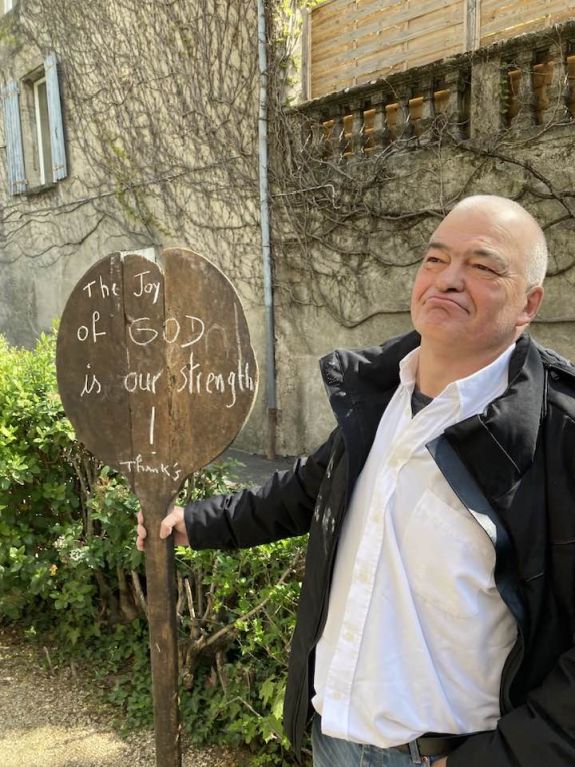 Na de dienst ontmoetten de koorleden buiten de kerk een man. Zijn gezicht straalde, hij droeg een bord met op de ene zijde de tekst ‘Tot ziens, welkom terug’ en op de andere kant ‘The joy of God is our strength! Thanks.’ In gebrekkig Engels zei hij: ,,Dat lied zongen jullie gisteravond in het concert en ik vond dat zo prachtig.”