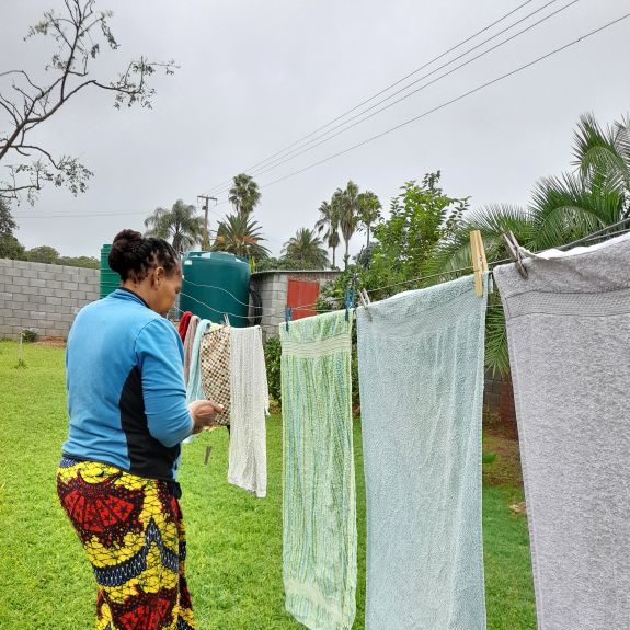 Sinds juli 2023 wonen we in Bulawayo, Zimbabwe. Het is hier meestal warm en droog. Een wasdroger hoeft niet. Een wasmachine is hier een luxe en ik besef amper hoe dankbaar ik hiervoor mag zijn. Ook onmisbaar is Abigail. Ze is niet meer weg te denken uit ons leven hier. Als hulp in de huishouding, maar ook als vriendin en zuster in Christus. Toen onze spullen uit Malawi gearriveerd waren, konden de eerste wasjes gedraaid worden. Abigail hing de was aan de lijn.