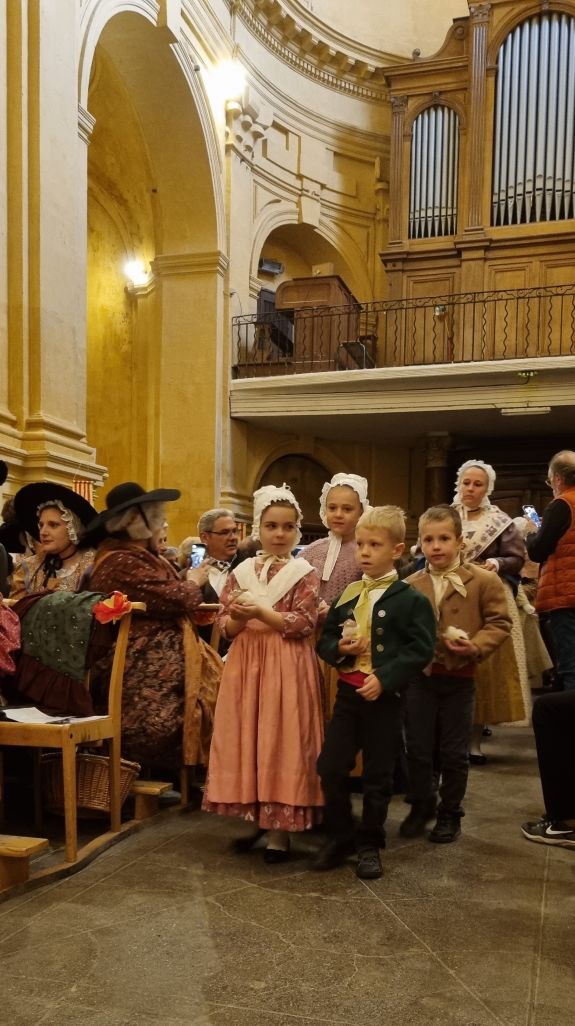 De tambourijnen (traditionele trommels) en galoubets (fluitjes) laten een prachtig lied klinken. Een lange stoet van levende santons loopt via het middenpad de kerk in. Priester Bernard Wauquier begint de mis in het Provençaals, het dialect van deze regio: ,,Au noum dóu Paire e dóu Fiéu et d’óu Saint Esprit, Amen” (In de naam van de Vader, de Zoon en de heilige Geest). Woorden uit Matteüs 24 vormen de leidraad voor zijn preek. ,,Wees geen toeschouwers, maar vredestichters en hoopboodschappers in een wereld die daar volop naar snakt. Deel Gods liefde, dan zul je vooruit komen op de weg van het leven.” De stoet van levende santons loopt weer de kerk binnen. Dit keer zijn hun handen gevuld. De kinderen dragen ieder een schaapje van katoen, de volwassenen brengen onder meer korenaren, een fles wijn, een pompoen, brood en druiven. Ze worden met eerbied en ontzag neergelegd voor het altaar, op een mooi kleed. Op 24 december wordt daar het kerstkind geplaatst.